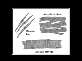 O documento descreve as principais funções do sistema muscular, incluindo locomoção, sustentação e bombeamento de sangue. Ele também discute as unidades estruturais dos músculos, como os filamentos de miosina e actina, e os tipos de fibras musculares, incluindo as lisas, esqueléticas e cardíacas. Por fim, aborda a fisiologia da contração muscular mediada pelo ATP e a excitabilidade muscular na placa motora.