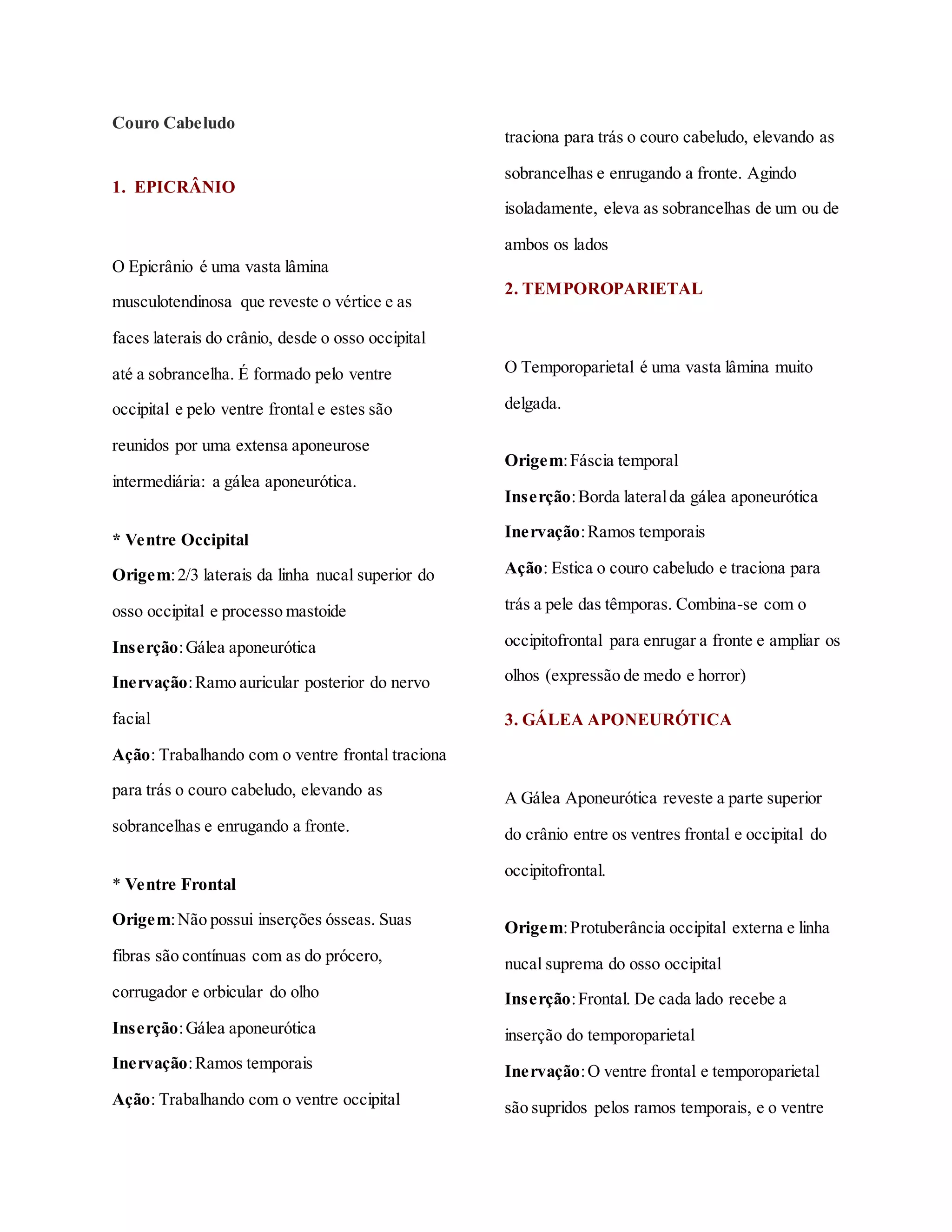 O documento descreve os principais músculos da cabeça e pescoço, incluindo: 1) o epicrânio, que reveste o crânio e traciona o couro cabeludo para trás; 2) os músculos faciais que controlam as expressões como o orbicular do olho e os músculos da boca; 3) os músculos da mandíbula envolvidos na mastigação.