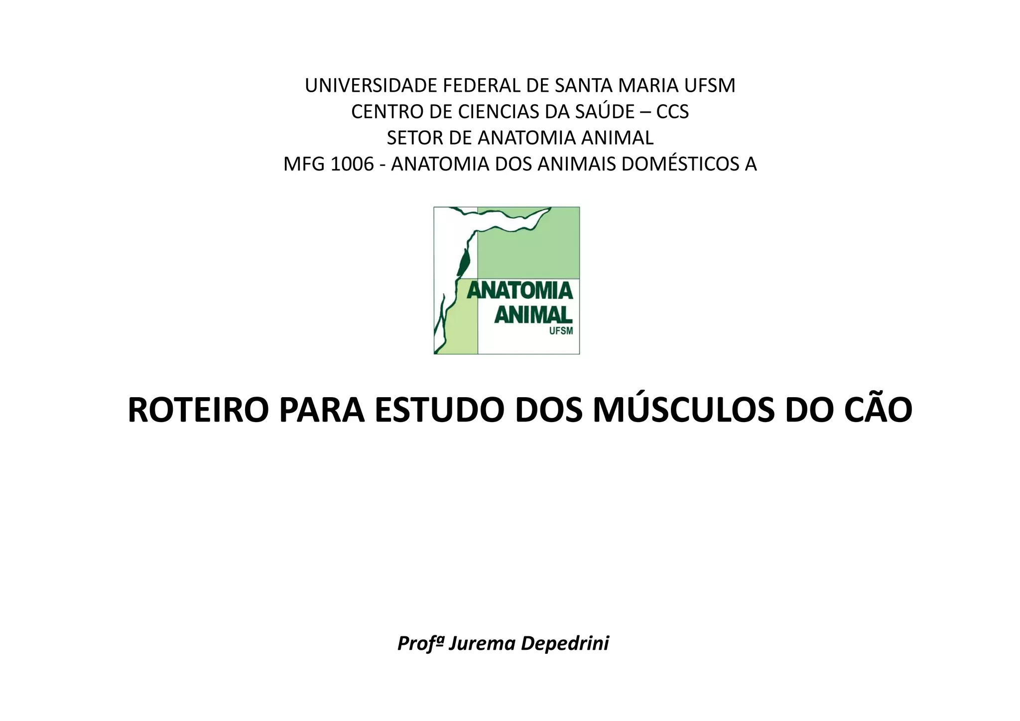 O documento apresenta um roteiro para o estudo dos músculos do cão, dividido em seções sobre os músculos do cinturão escapular, ombro, braço, antebraço e mão. As seções incluem imagens anatômicas e descrições sobre a origem, inserção e ação de cada músculo.
