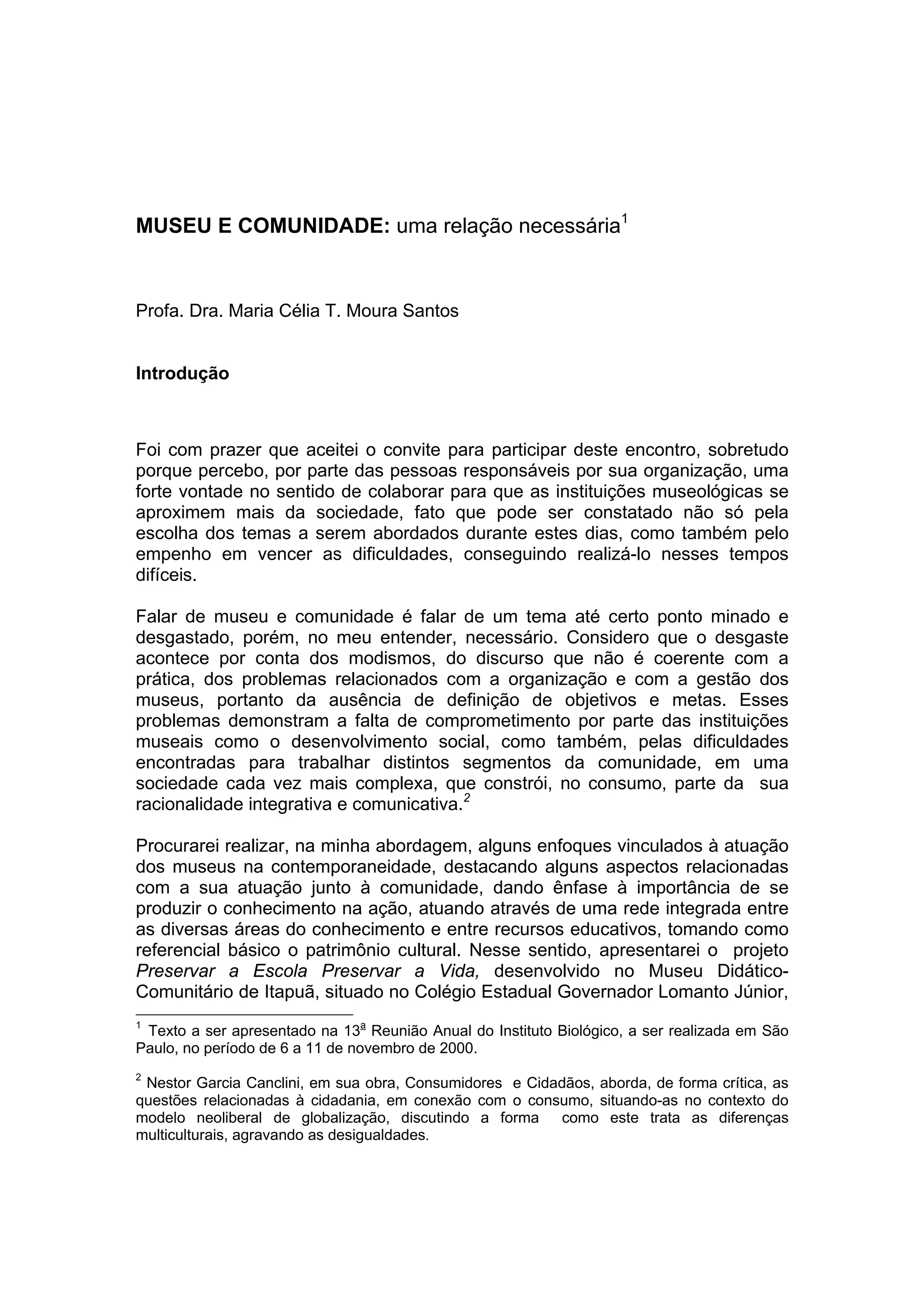 O documento discute a relação entre museus e comunidades. Apresenta a evolução histórica dessa relação, desde a década de 1950 quando os museus começaram a se preocupar com seu papel educativo e social. Também destaca a importância de definir quais segmentos da comunidade o museu irá atuar, e de trabalhar de forma respeitosa e colaborativa com esses grupos. Por fim, apresenta o projeto "Preservar a Escola Preservar a Vida" como exemplo de ação museal junto à comunidade.