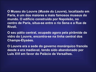 O Museu do Louvre em Paris é um dos maiores e mais famosos museus do mundo, localizado no antigo palácio real que foi aberto ao público como museu durante a Revolução Francesa. O Louvre abriga obras-primas mundialmente famosas como a Mona Lisa, a Vitória de Samotrácia e a Vênus de Milo, além de grandes coleções de arte egípcia e europeia.