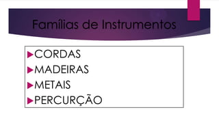 O documento resume as famílias de instrumentos musicais (cordas, madeiras, metais e percussão), fornecendo detalhes históricos sobre cada família. Também explica a história da orquestra desde a Idade Média, quando grupos instrumentais começaram a se formar sem estrutura definida, até os dias atuais, quando uma orquestra típica inclui 26 ou mais músicos de diferentes instrumentos sob a direção de um maestro.
