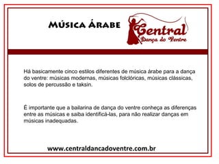 O documento descreve os cinco principais estilos de música árabe para dança do ventre: músicas modernas, folclóricas, clássicas, solos de percussão e taksin. Explica as características de cada estilo musical e como eles afetam os movimentos da dançarina.