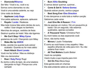 O documento lista as letras de 14 músicas populares que falam sobre amor, empoderamento e superação. As músicas incluem "Diamonds" de Rihanna, "Applause" de Lady Gaga, "Royals" de Lorde, "We Can't Stop" de Miley Cyrus e outras canções de sucesso de artistas como Justin Timberlake, Alicia Keys e One Direction.