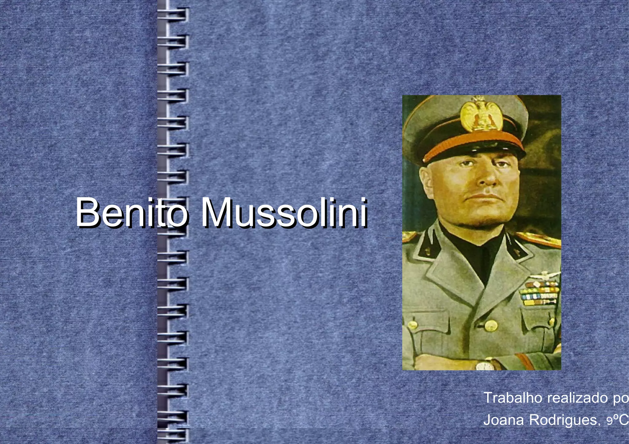 Benito Mussolini foi um político italiano que se tornou ditador fascista da Itália entre 1925 e 1943. Ele começou sua carreira como socialista, mas posteriormente fundou o Partido Nacional Fascista e estabeleceu uma ditadura autoritária na Itália. Mussolini alinhou a Itália com a Alemanha nazista durante a Segunda Guerra Mundial, mas foi deposto em 1943 e morto pelo exército italiano em 1945.