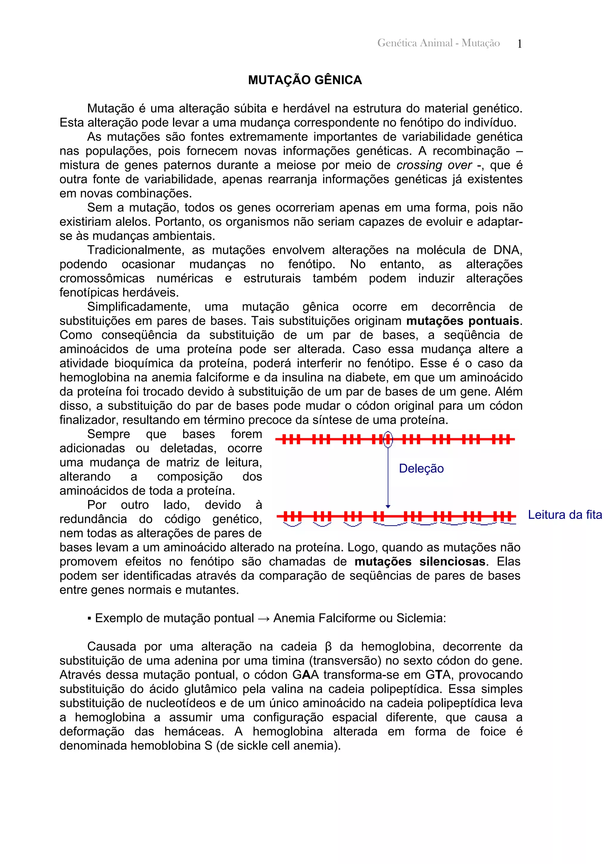 1) Uma mutação é uma alteração herdável no material genético que pode levar a mudanças no fenótipo; 2) As mutações fornecem variabilidade genética essencial para a evolução e adaptação; 3) Mutagens físicos e químicos podem induzir mutações no DNA, como substituições de bases, que resultam em alterações nas proteínas.
