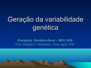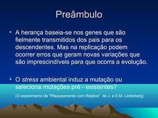 1) O documento discute a geração da variabilidade genética através de mutações no DNA que criam novas variações.