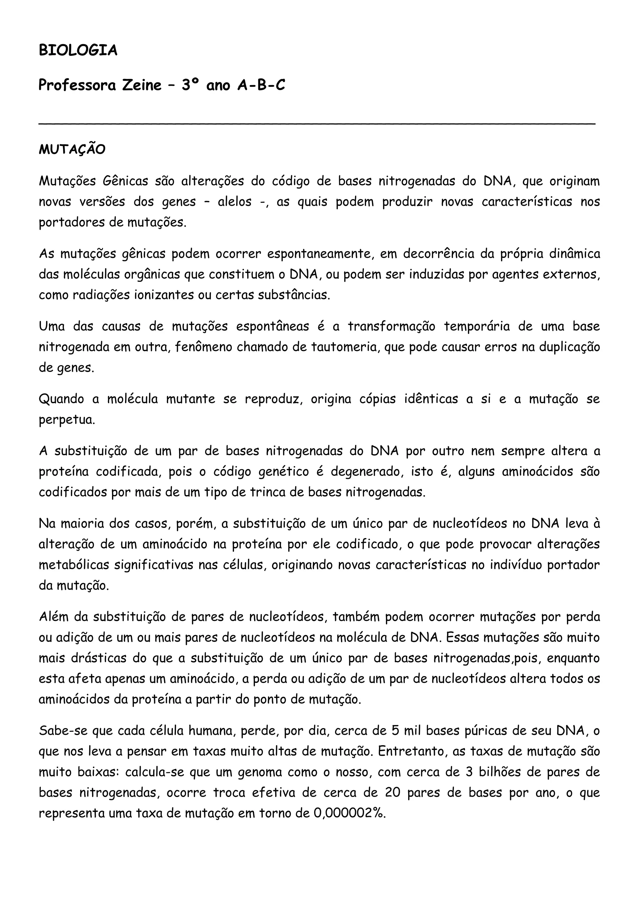 Mutações gênicas são alterações no DNA que podem ocorrer espontaneamente ou ser induzidas por agentes externos e originam novas versões dos genes. As células possuem mecanismos eficientes de reparo do DNA que mantêm a taxa de mutação baixa, apesar da suscetibilidade do DNA a erros. Agentes mutagênicos como radiação ionizante podem induzir mutações ao aumentar a taxa de mutação dos genes.