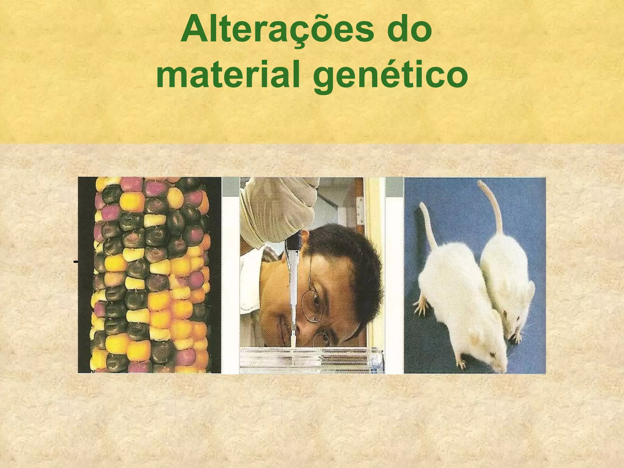 O documento discute diferentes tipos de mutações genéticas e cromossômicas, incluindo suas causas e consequências. Aborda mutações pontuais, numéricas e estruturais que podem ocorrer a nível do gene ou cromossomo e estão associadas a síndromes genéticas. Também explica como algumas mutações podem ativar processos oncogênicos e levar ao câncer.