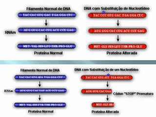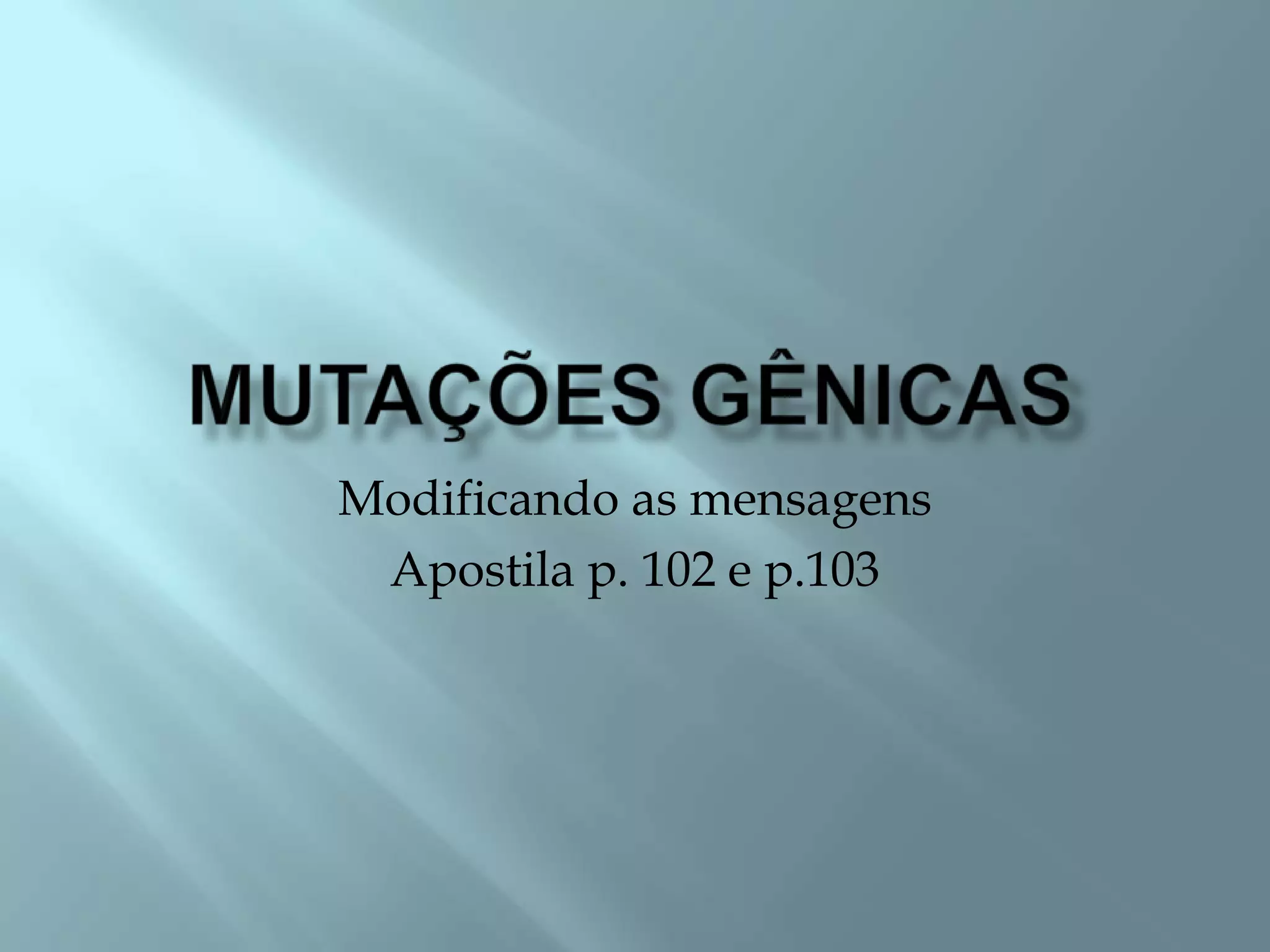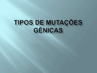 O documento discute mutações genéticas, definindo-as como alterações permanentes no DNA que podem ocorrer em qualquer célula e envolver cromossomos ou genes. As mutações podem ser espontâneas, induzidas por agentes mutagênicos ou ocorrer durante a replicação do DNA, e podem levar a novas características ou doenças nas gerações futuras.