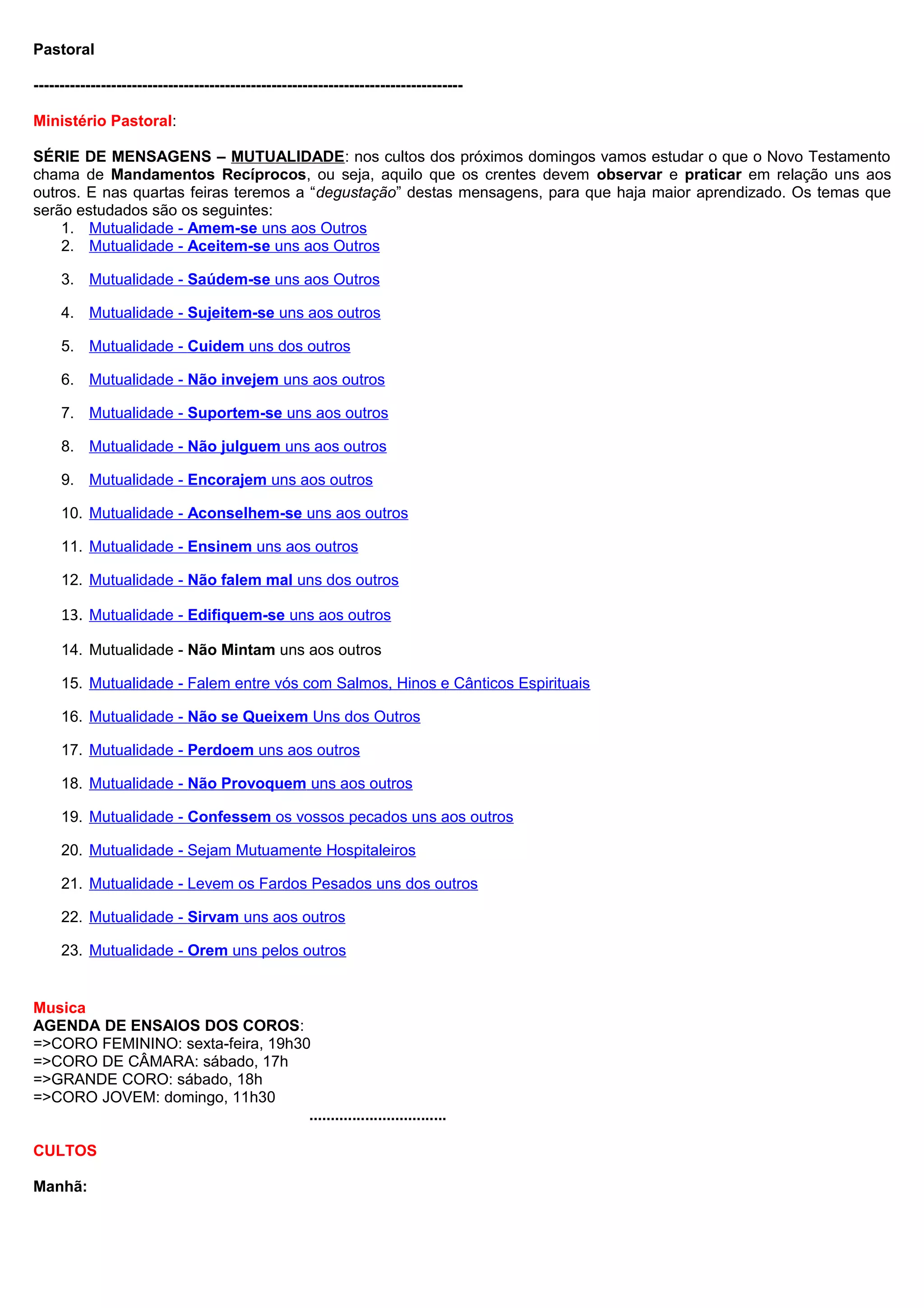A igreja realizará uma série de mensagens sobre mutualidade nos próximos domingos, ensinando sobre como os crentes devem se tratar mutuamente com amor, aceitação, respeito e apoio. Os coros da igreja têm ensaios programados nas próximas semanas. A igreja dá boas-vindas a novos visitantes e membros.