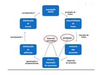 O documento descreve diferentes tipos de mutualismos entre organismos, incluindo interações animal-planta, animal-animal, bactéria-animal e bactéria-planta. Essas interações envolvem benefícios mútuos como nutrição, proteção e dispersão de sementes para os organismos envolvidos.