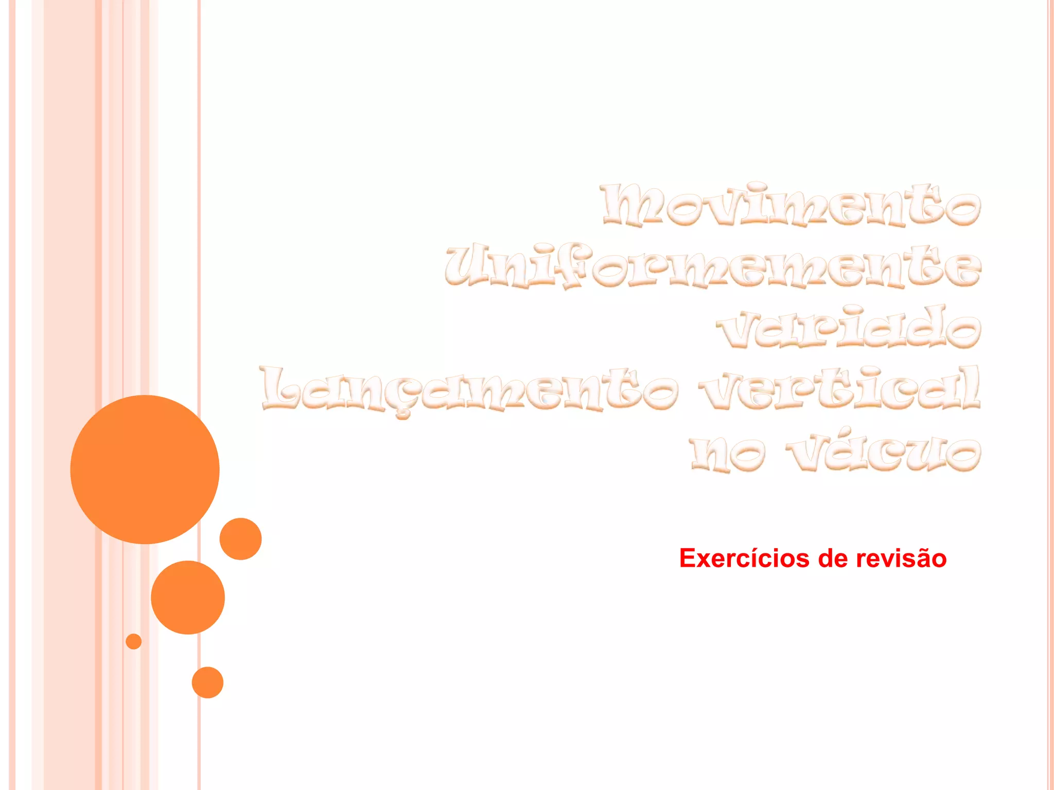 1) O documento contém 15 exercícios de física sobre movimento retilíneo uniforme e uniformemente variado, movimento vertical com gravidade e lançamentos verticais. 2) Os exercícios envolvem cálculos de velocidade final, aceleração, distância percorrida, tempo e altura máxima usando as equações do movimento retilíneo uniforme e uniformemente variado e do movimento vertical com gravidade. 3) As questões devem ser resolvidas aplicando-se os conceitos de kinematica estudados.