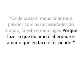 O documento enfatiza que a felicidade está em usar seus talentos e paixões para atender às necessidades do mundo. Fazer o que se ama traz liberdade e amar o que se faz resulta em felicidade.