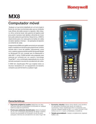 O documento descreve o computador móvel MX8 da Honeywell projetado para coleta de dados em ambientes industriais e varejo. O MX8 oferece durabilidade, ergonomia e conectividade sem fio para aumentar a produtividade dos funcionários em diversos ambientes da cadeia de suprimentos.