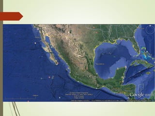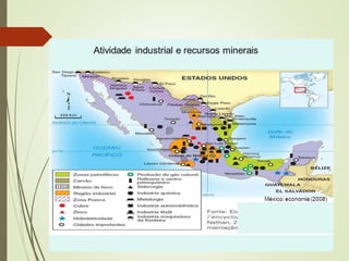 O documento descreve as três principais regiões geográficas do México: a costa ocidental com clima desértico, a costa oriental com clima tropical úmido e o planalto central. A maior parte da população vive no planalto central, onde se localiza a capital Cidade do México. A economia do México é baseada em setores como turismo, indústria, petróleo e agropecuária.