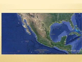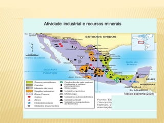 O México possui uma área de 1,9 milhões de km2 e é dividido em três regiões naturais principais: a costa ocidental com relevo acidentado e clima desértico, a costa oriental com planície costeira e clima tropical, e o planalto central com temperaturas amenas. Sua população de 124 milhões é majoritariamente mestiça e católica, e 75% vive no planalto central onde está localizada a capital Cidade do México. A economia mexicana é baseada em setores como turismo