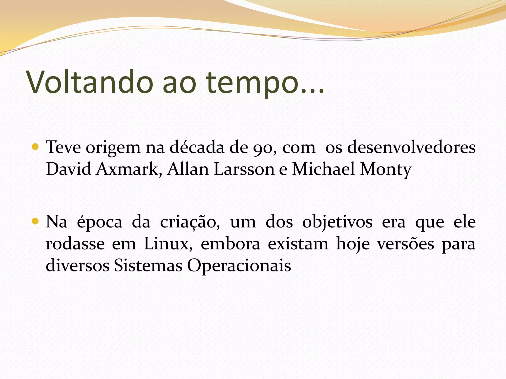 O documento descreve a história e características do MySQL, um banco de dados open source. Começou a ser desenvolvido na década de 1990 e hoje é mantido por cerca de 400 profissionais. O MySQL se tornou uma alternativa popular por ser rápido, flexível e ter licença gratuita ou comercial.