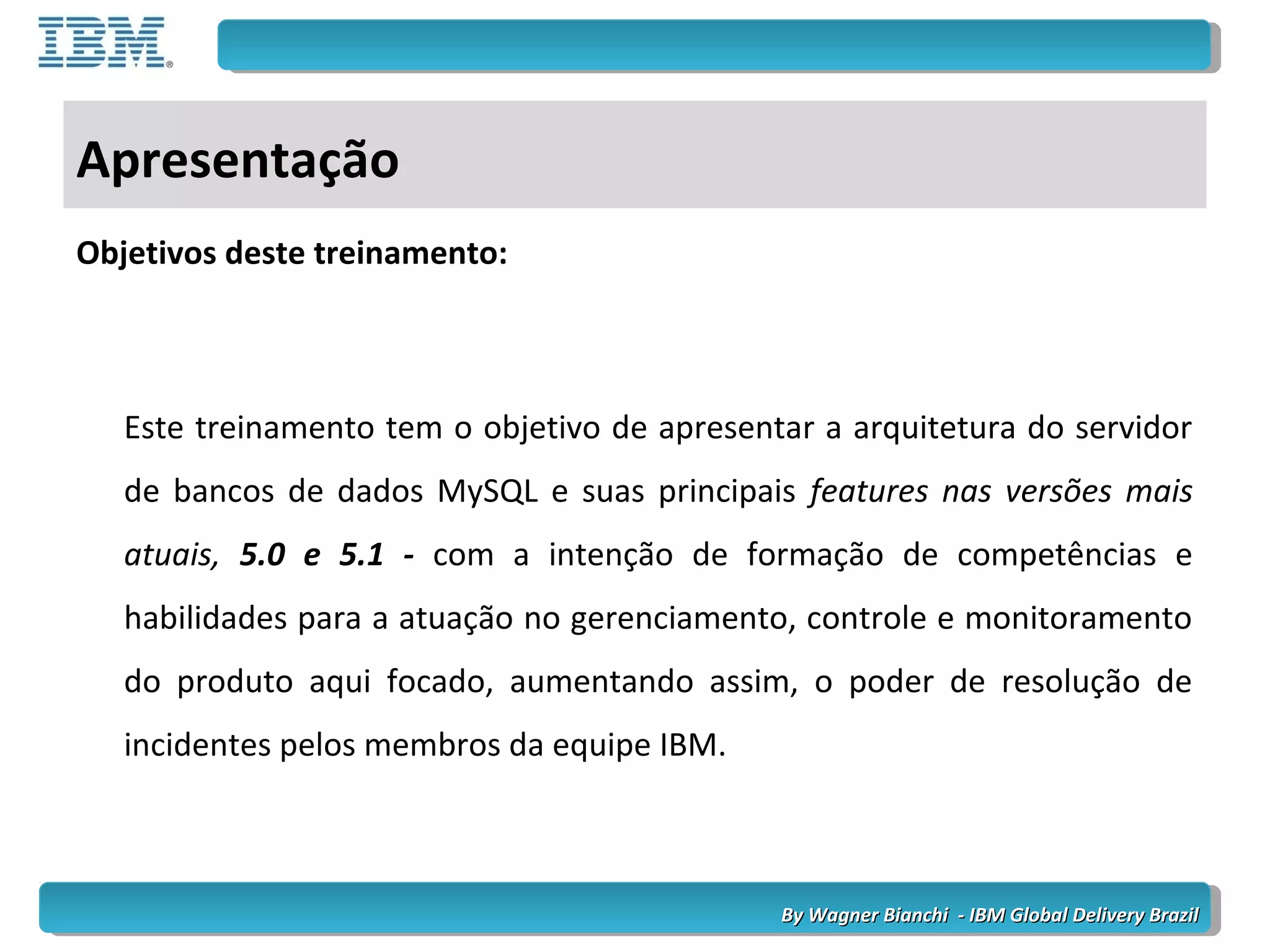 1. O treinamento tem o objetivo de apresentar a arquitetura e principais recursos do MySQL versões 5.0 e 5.1 para formação de competências na administração e monitoramento do banco de dados.
