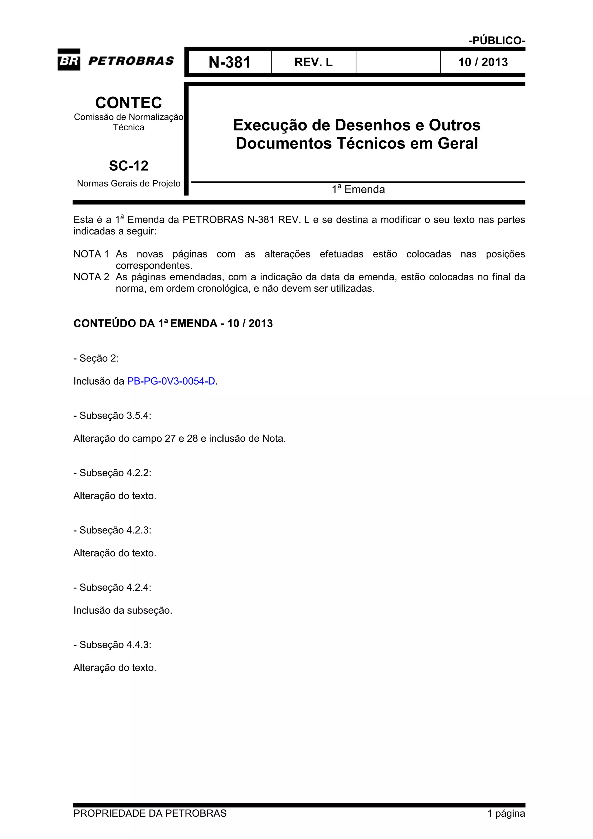 O documento descreve uma emenda à Norma Técnica PETROBRAS N-381 REV. L que altera seções e subseções da norma para especificar novas referências e procedimentos. A emenda inclui alterações nas subseções 2, 3.5.4, 4.2.2, 4.2.3, 4.2.4 e 4.4.3 da norma.