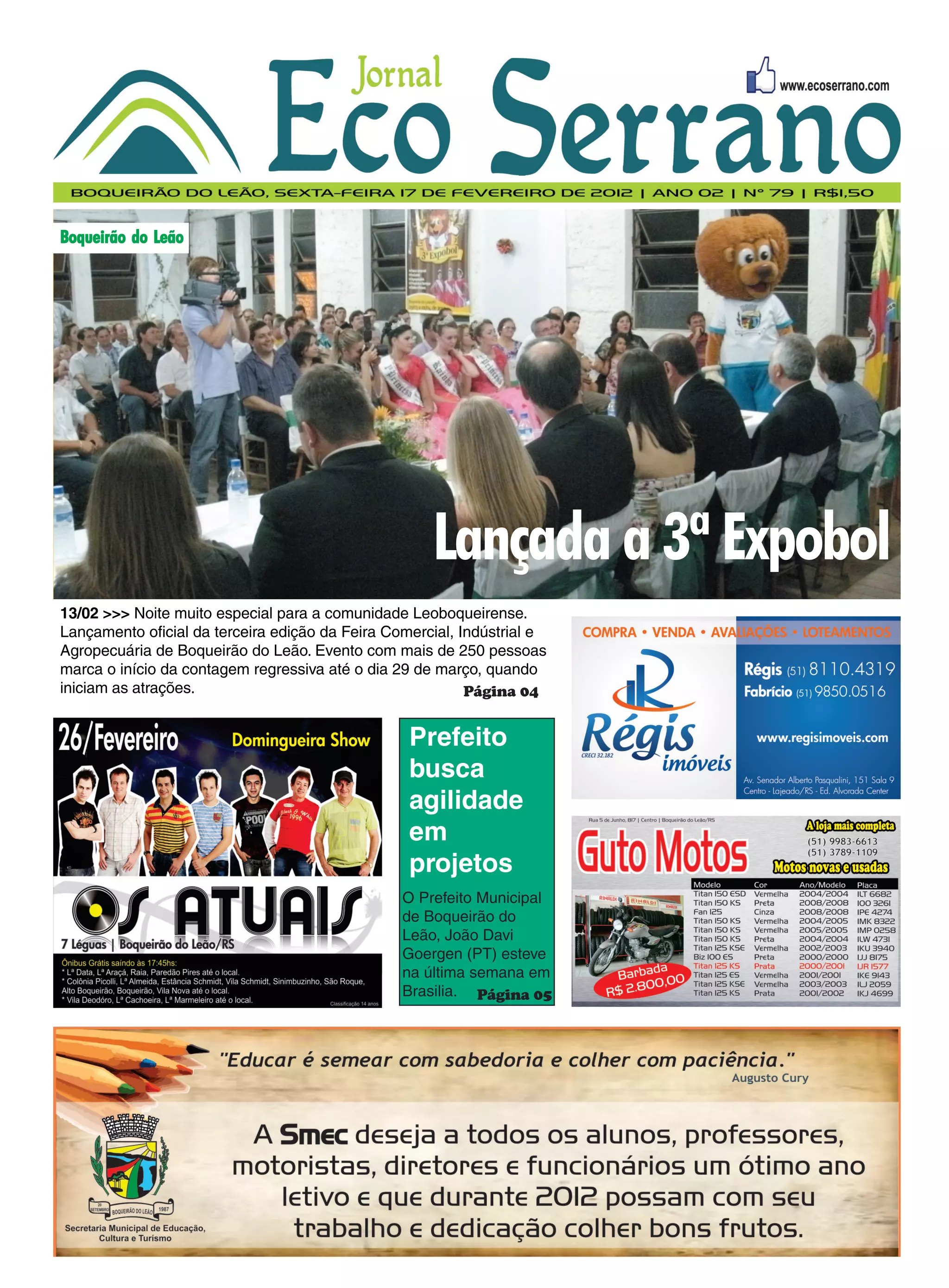 O documento anuncia (1) o lançamento da terceira edição da Feira Comercial, Industrial e Agropecuária de Boqueirão do Leão, marcado por mais de 250 pessoas, (2) a viagem do prefeito João Davi Goergen à Brasília para buscar agilidade em projetos, e (3) a programação da Campanha da Fraternidade da Igreja Católica sobre saúde pública no Brasil.