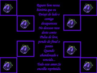 Repare bem nessahistória que eu Deixei de lado e comigo desapareceu No descaso raso deste conto Pulsa de leve, pondo do final o ponto Quando abandonado e vencido... Todo esse amor.Se encolhe reprimido.