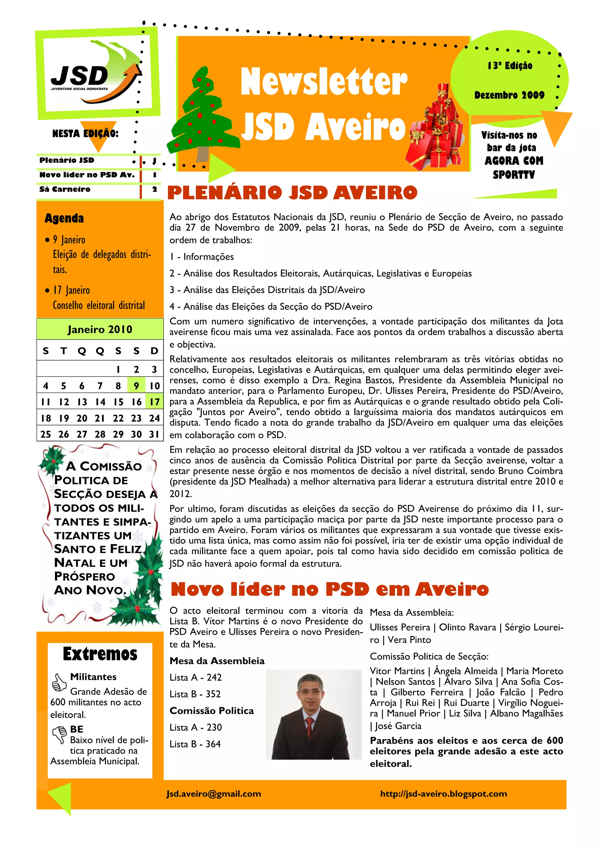 1. A newsletter relata as eleições da JSD e do PSD em Aveiro, com a vitória de Bruno Coimbra para liderar a JSD distrital e da Lista B para liderar o PSD local, eleger Vítor Martins como presidente.