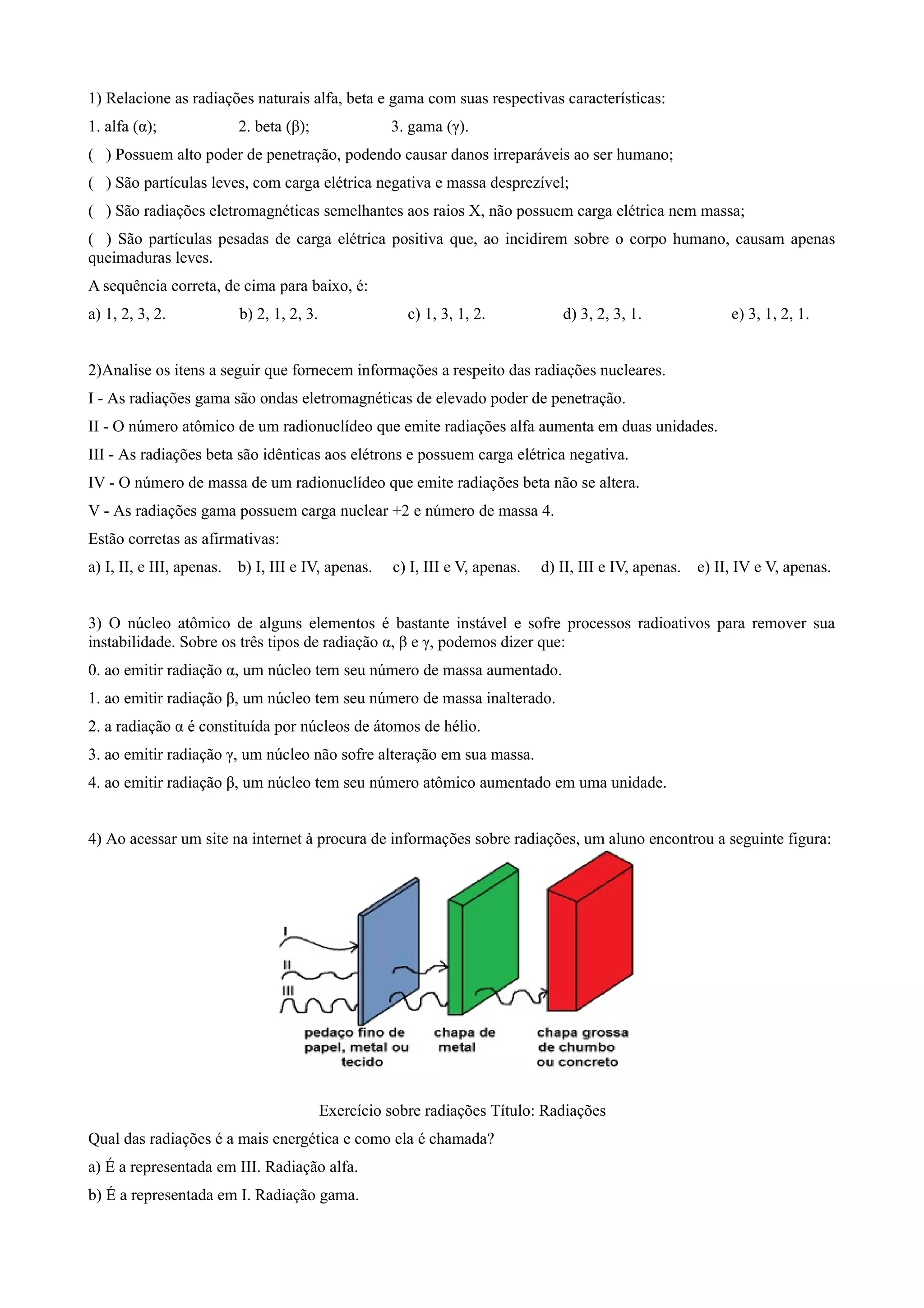 1) O documento fornece informações sobre as características das radiações alfa, beta e gama.