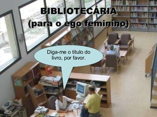 Um homem pergunta à bibliotecária sobre um livro chamado "HOMENS, O SEXO FORTE". A bibliotecária responde que a ficção científica está no andar de baixo, sugerindo que o livro que o homem procura não existe.