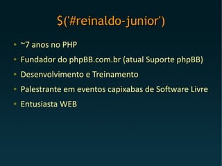 O documento apresenta uma palestra sobre jQuery e AJAX. Aborda conceitos como DOM Scripting, manipulação de dados com XML/JSON, requisições assíncronas e como jQuery une essas técnicas. Também discute vantagens de jQuery como facilitar desenvolvimento, popularidade e plugins disponíveis.