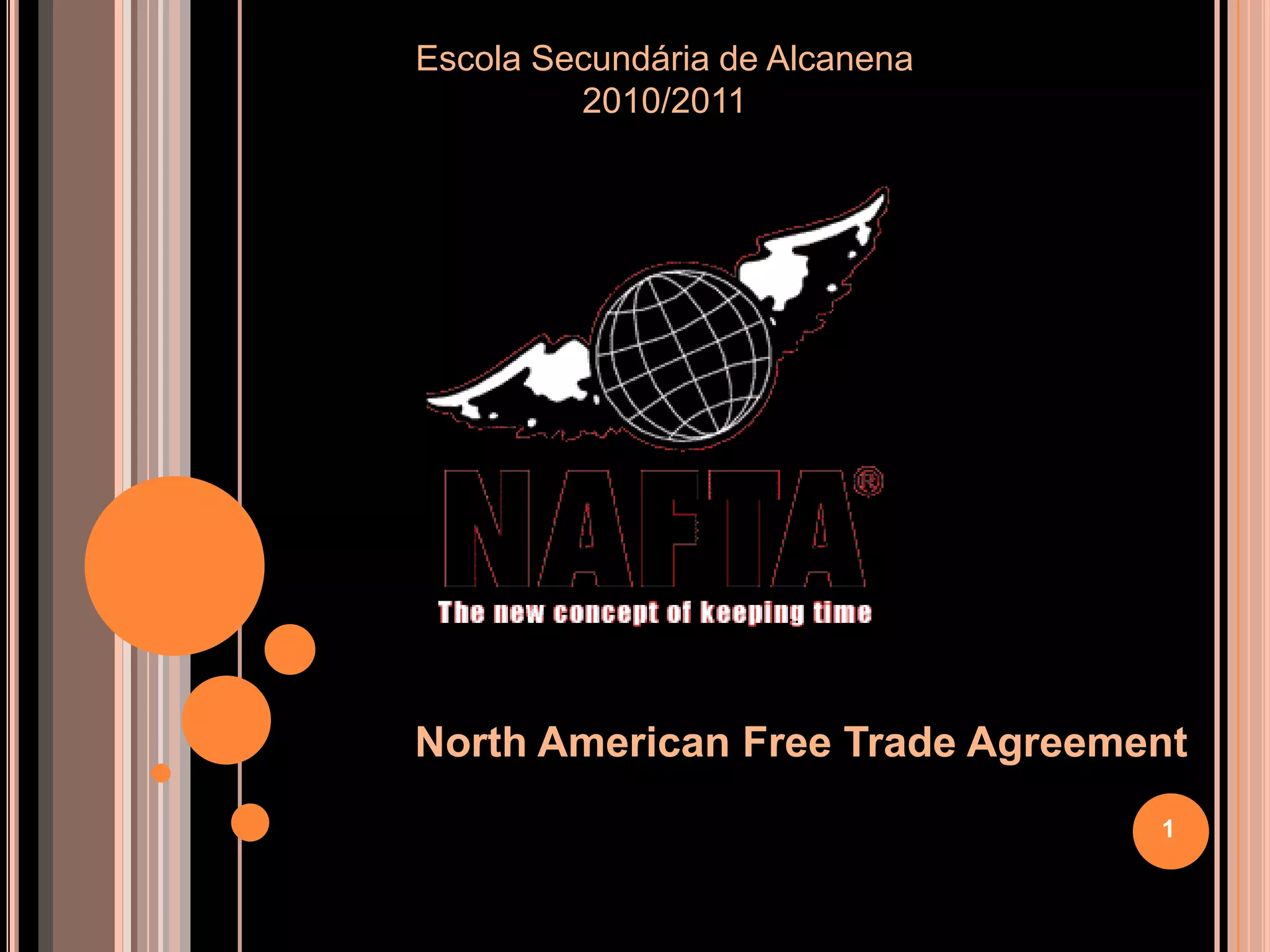 O NAFTA (Acordo de Comércio Livre da América do Norte) é um tratado assinado em 1992 pelos Estados Unidos, Canadá e México para criar uma zona de livre comércio. O objetivo é eliminar barreiras alfandegárias, promover competição justa, aumentar investimentos e proteger propriedade intelectual entre os países membros.