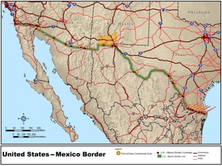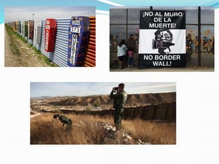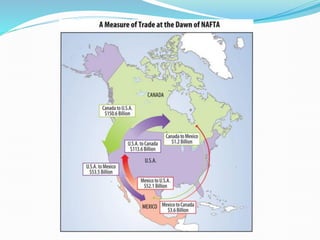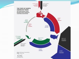 O documento discute o NAFTA (Acordo de Livre Comércio da América do Norte) assinado em 1994 entre EUA, Canadá e México para promover o livre comércio de bens e serviços. Apesar disso, o acordo não permite livre circulação de pessoas entre os países, especialmente na fronteira EUA-México. O documento também discute os efeitos negativos do NAFTA como a desindustrialização nos EUA e a dependência econômica do México em relação aos EUA.
