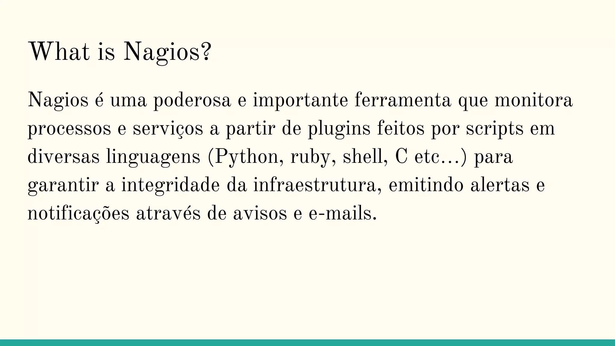 O documento descreve a instalação e configuração do Nagios, um sistema de monitoramento de infraestrutura, e seus componentes principais: o servidor Nagios, o gerenciador NCONF e o cliente NRPE. Ele explica como instalar cada parte, configurar checks em hosts remotos usando o NRPE e definir serviços, hosts e comandos de checagem no NCONF.