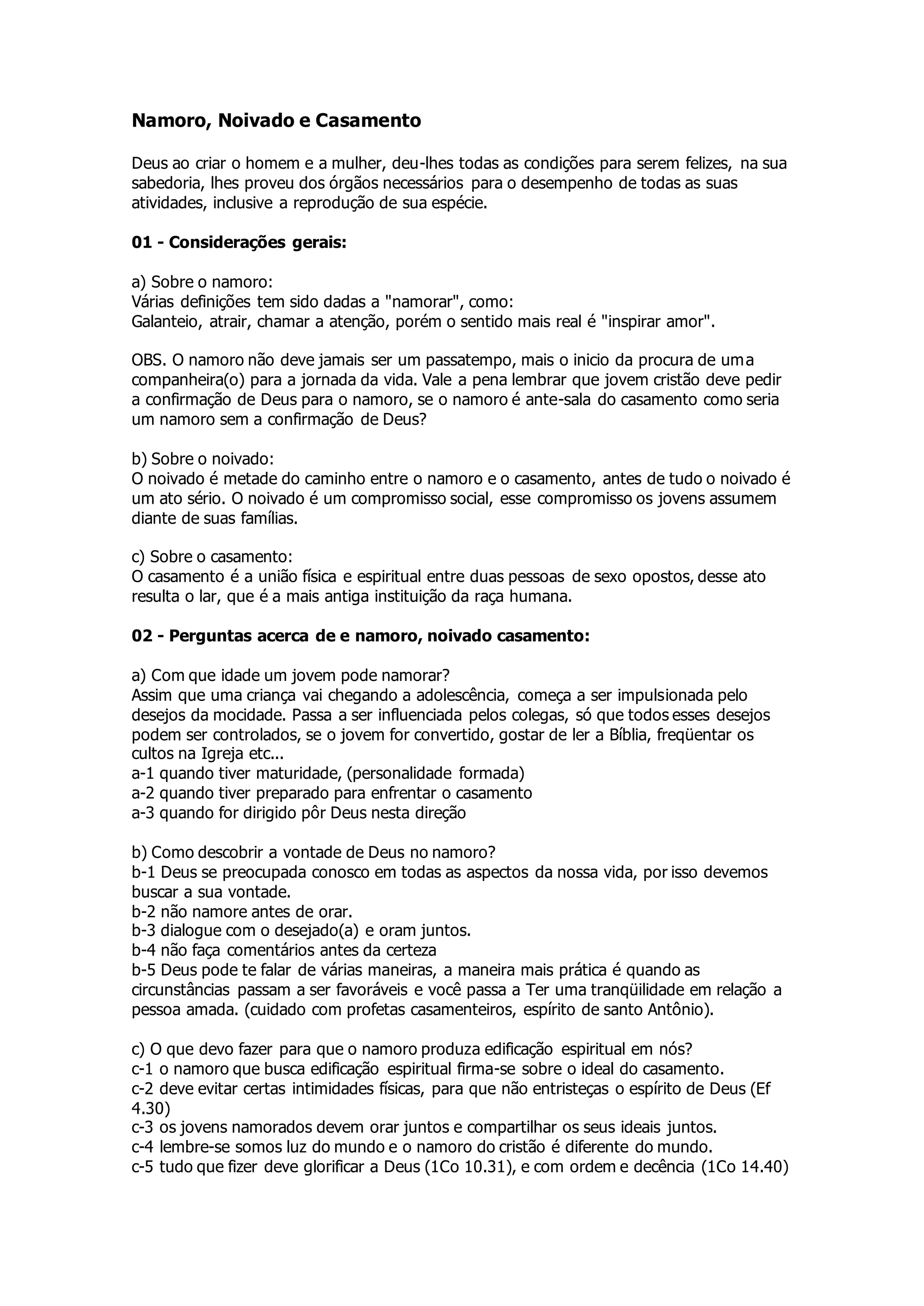 O documento discute os princípios bíblicos do namoro, noivado e casamento cristão. Ele explica que Deus criou o homem e a mulher para serem felizes juntos e reproduzirem sua espécie. O texto fornece orientações sobre como descobrir a vontade de Deus no namoro, as regras para um namoro cristão edificante e quando dois jovens estão prontos para o noivado e casamento.
