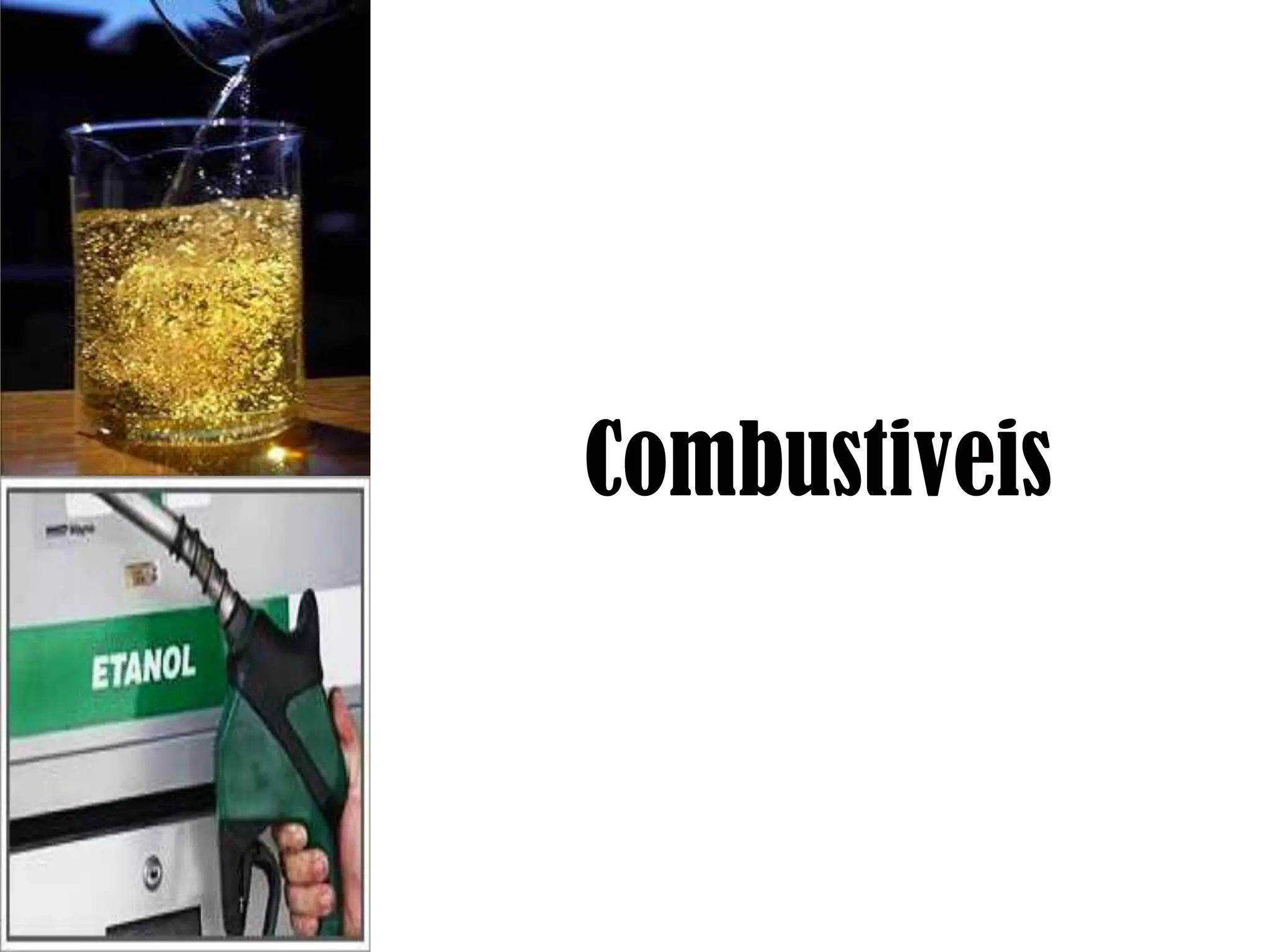 O documento discute os tipos de combustíveis, incluindo gasolina e etanol. A gasolina é feita de petróleo e contém aditivos para melhorar o desempenho. Há três tipos de gasolina: comum, aditivada e premium. O etanol é produzido a partir da fermentação da cana-de-açúcar ou milho e é usado misturado na gasolina ou puro em carros flex.