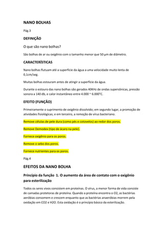 O documento descreve as características e efeitos das nano bolhas. São bolhas de ar ou oxigênio menores que 50 μm que flutuam lentamente na água. Quando estouram, geram ondas ultrassônicas e calor que podem esterilizar, limpar a pele e aliviar dores. As nano bolhas aumentam a área de contato com o oxigênio e o tempo de dissolução, promovendo a oxidação e esterilização.