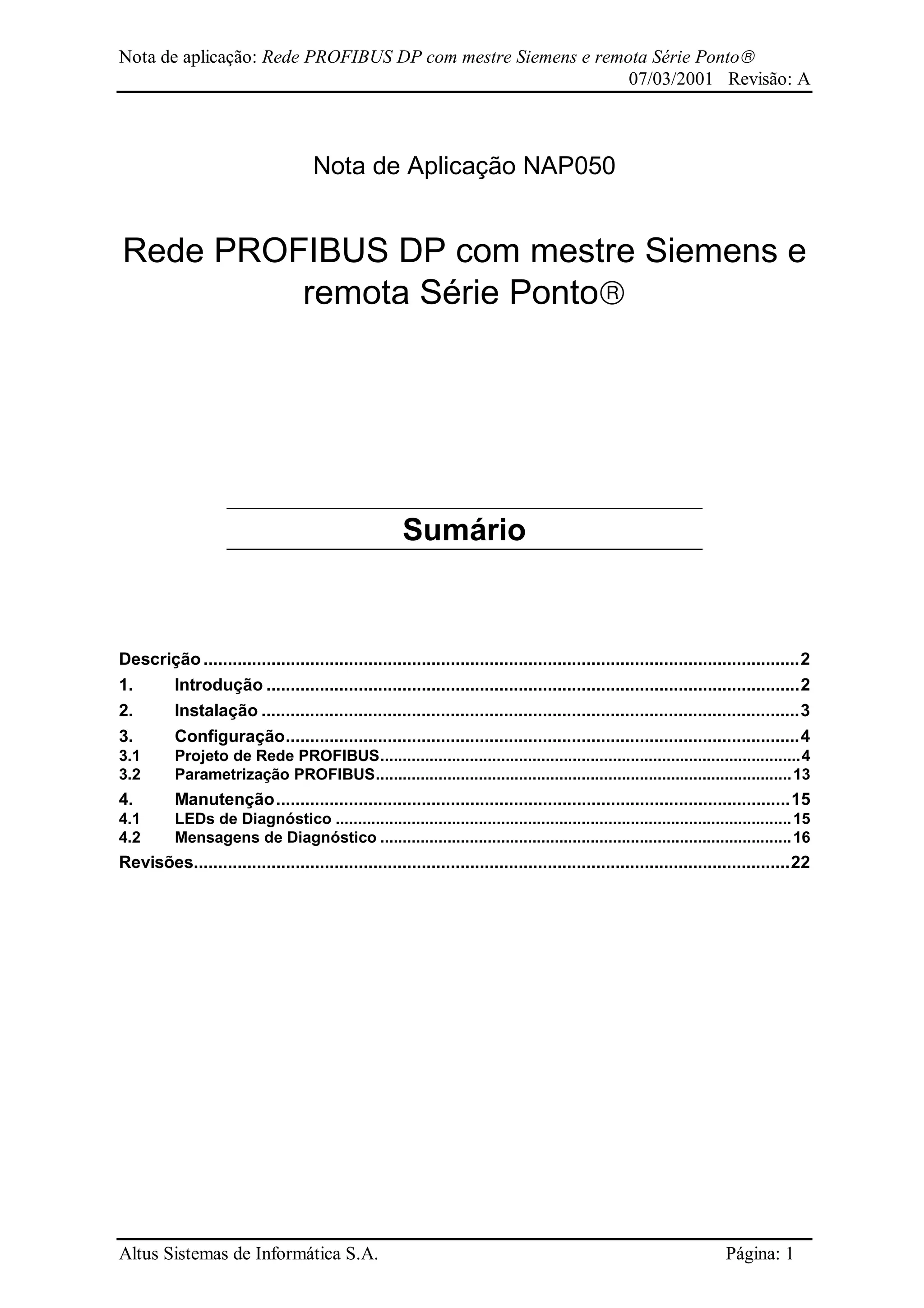 Este documento descreve como configurar uma rede PROFIBUS DP utilizando uma CPU Siemens S7-300 como mestre e uma cabeça de rede Altus Série Ponto como escravo, além de módulos de E/I remotos. Ele explica como criar o projeto no software STEP 7, inserir os equipamentos, definir seus endereços e parâmetros, e transferir a configuração para a CPU.