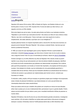 Napoleon Hill foi um escritor e pesquisador norte-americano que estudou durante 20 anos os hábitos de pessoas de sucesso. Ele entrevistou mais de 500 milionários para identificar os princípios comuns por trás de suas realizações. Seu livro mais famoso, Pense e Enriqueça, popularizou o conceito de "mente mestra" e forneceu dicas práticas para alcançar objetivos.