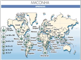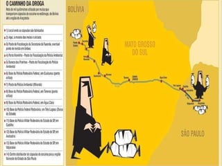 O documento descreve os principais aspectos do narcotráfico, incluindo suas origens etimológicas, os tipos de drogas ilícitas comercializadas, como são produzidas e consumidas, as rotas de tráfico na Amazônia brasileira, e como as organizações criminosas se adaptaram à globalização.