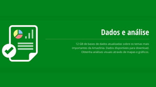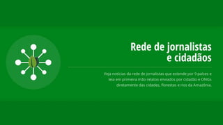 O documento discute como narrativas visuais e comunidades interconectadas podem ser usadas para monitorar e relatar sobre desmatamento, queimadas, emissões de carbono e qualidade da água. Ele fornece exemplos de organizações que usam tecnologia e dados compartilhados por comunidades para mapear desmatamento, detectar queimadas e medir poluentes da água.