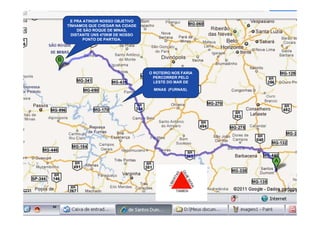 O documento descreve a viagem de um grupo que percorreu o Rio São Francisco, desde sua foz até sua nascente na Serra da Canastra, em Minas Gerais. Eles visitaram várias cidades ao longo do caminho, como Ribeirão Vermelho e São Roque de Minas, e descreveram paisagens e atrações como a Cachoeira Casca d'Anta.