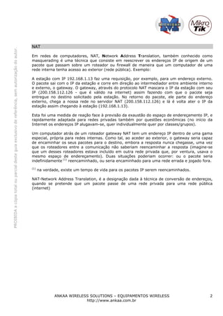 NAT (Network Address Translation) é uma técnica que permite que dispositivos de uma rede interna acessem a internet usando o endereço IP de um roteador. O roteador mascara os endereços IP internos e encaminha pacotes de volta corretamente. O documento explica como configurar NAT no Mikrotik para fornecer acesso à internet para uma rede interna.