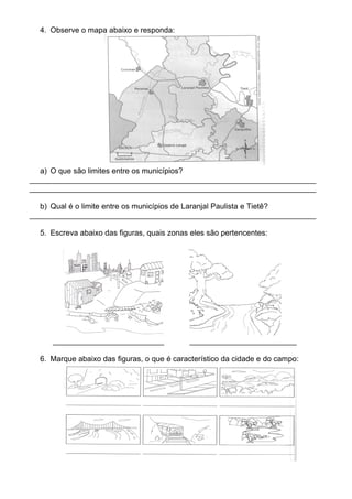 O documento é uma avaliação de estudantes da 3a série sobre ciências, geografia e história. A avaliação contém perguntas sobre recursos naturais como a água, alimentação saudável, atividades econômicas, escravidão, povos indígenas e formação de cidades.