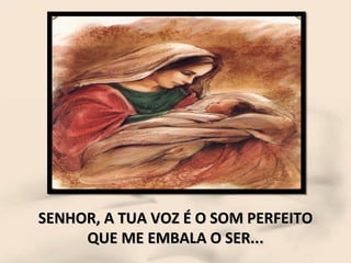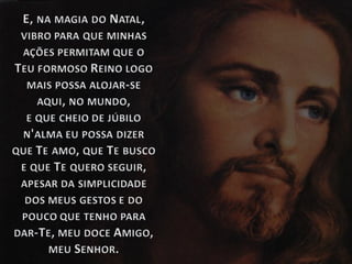 O documento é uma oração poética dirigida a Jesus que celebra seu nascimento e busca se inspirar em seus ensinamentos de amor, paz e serviço aos outros. Em três frases, o texto reflete sobre como a voz, o olhar e as mãos de Jesus trazem conforto e guia, e deseja honrar seu exemplo de trabalho e entrega total a Deus.