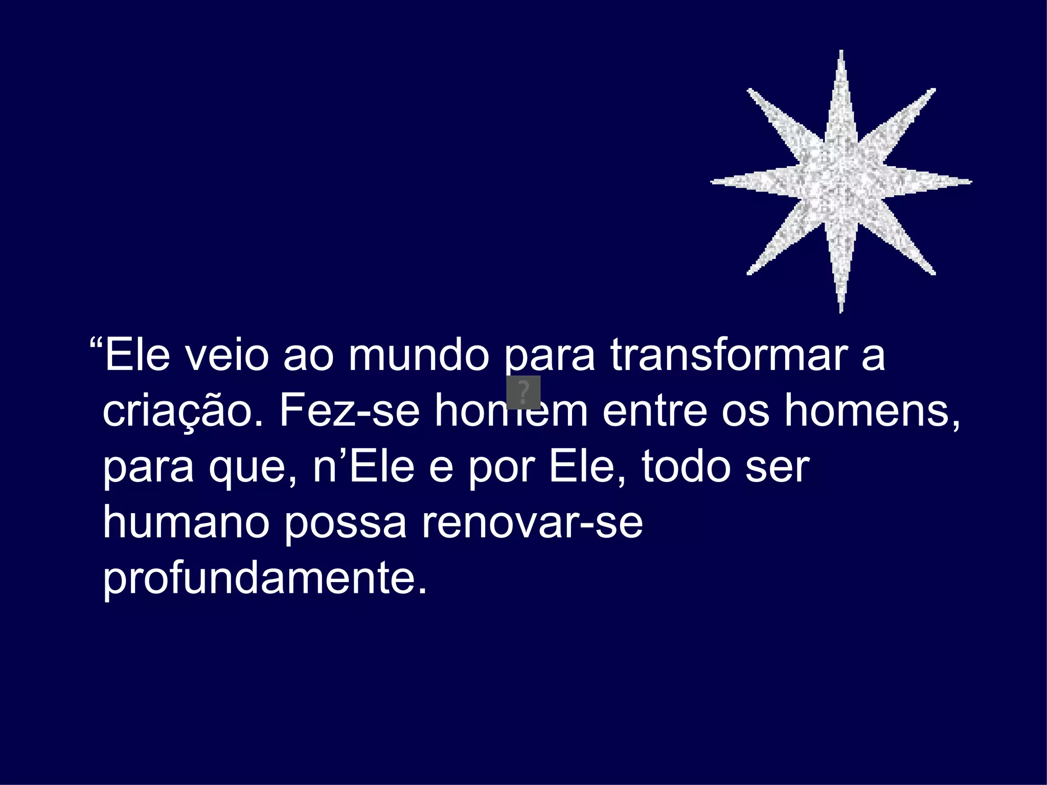 O documento discute como Cristo veio ao mundo para transformar a criação e permitir que os seres humanos se renovem profundamente por meio dele. Sua vinda introduziu a humanidade à divindade e deu a possibilidade de participar de sua vida divina através da fé. Cristo nasceu para nós e Deus se fez homem para tornar os homens participantes de sua própria divindade.