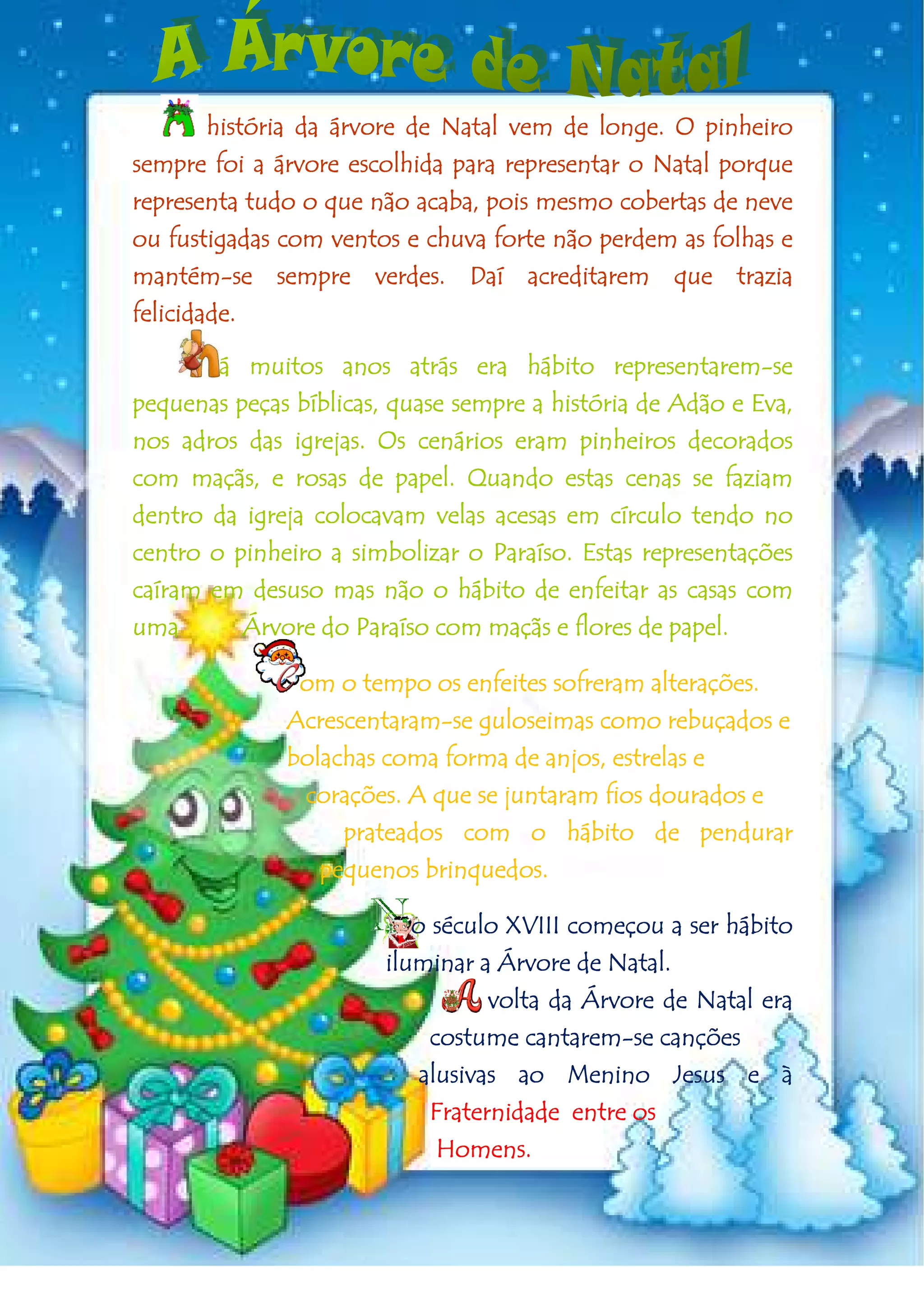 A árvore de Natal tem origem em tradições antigas de representar cenas bíblicas em pinheiros. Com o tempo, os pinheiros passaram a ser enfeitados com guloseimas, luzes e brinquedos para simbolizar alegria e fraternidade na época natalina. Atualmente, os enfeites da árvore representam valores como proteção, esperança e generosidade.