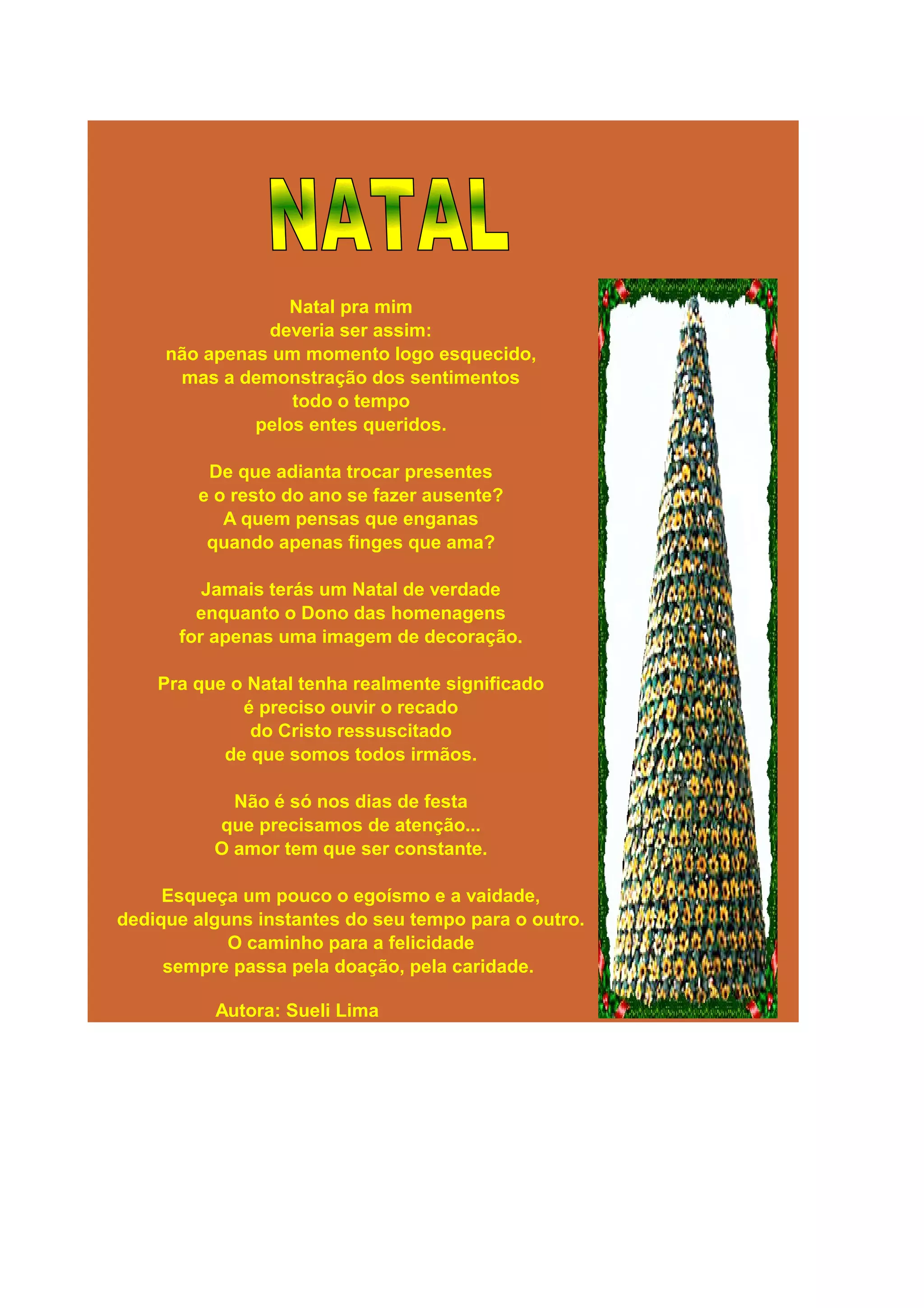 O poema reflete que o Natal deveria ser um momento para demonstrar sentimentos de amor e caridade para com os entes queridos durante todo o ano, e não apenas em datas comemorativas. A autora argumenta que o verdadeiro significado do Natal está em ouvir o ensinamento de Cristo sobre a fraternidade entre todos os seres humanos.