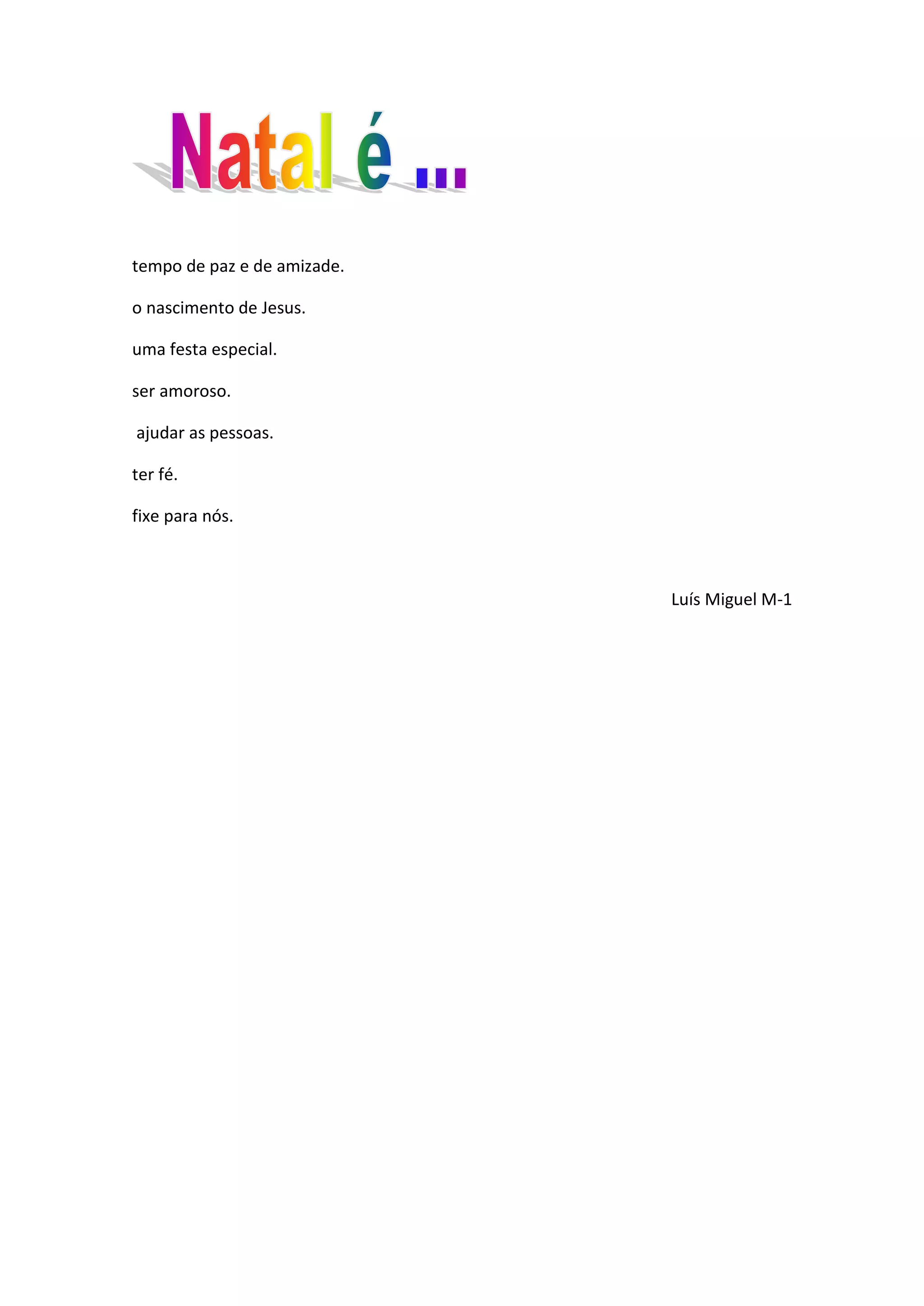 tempo de paze de amizade.<br />o nascimento de Jesus.<br />uma festa especial.<br />ser amoroso.<br /> ajudar as pessoas.<br />ter fé.<br />fixe para nós.<br />Luís Miguel M-1<br />