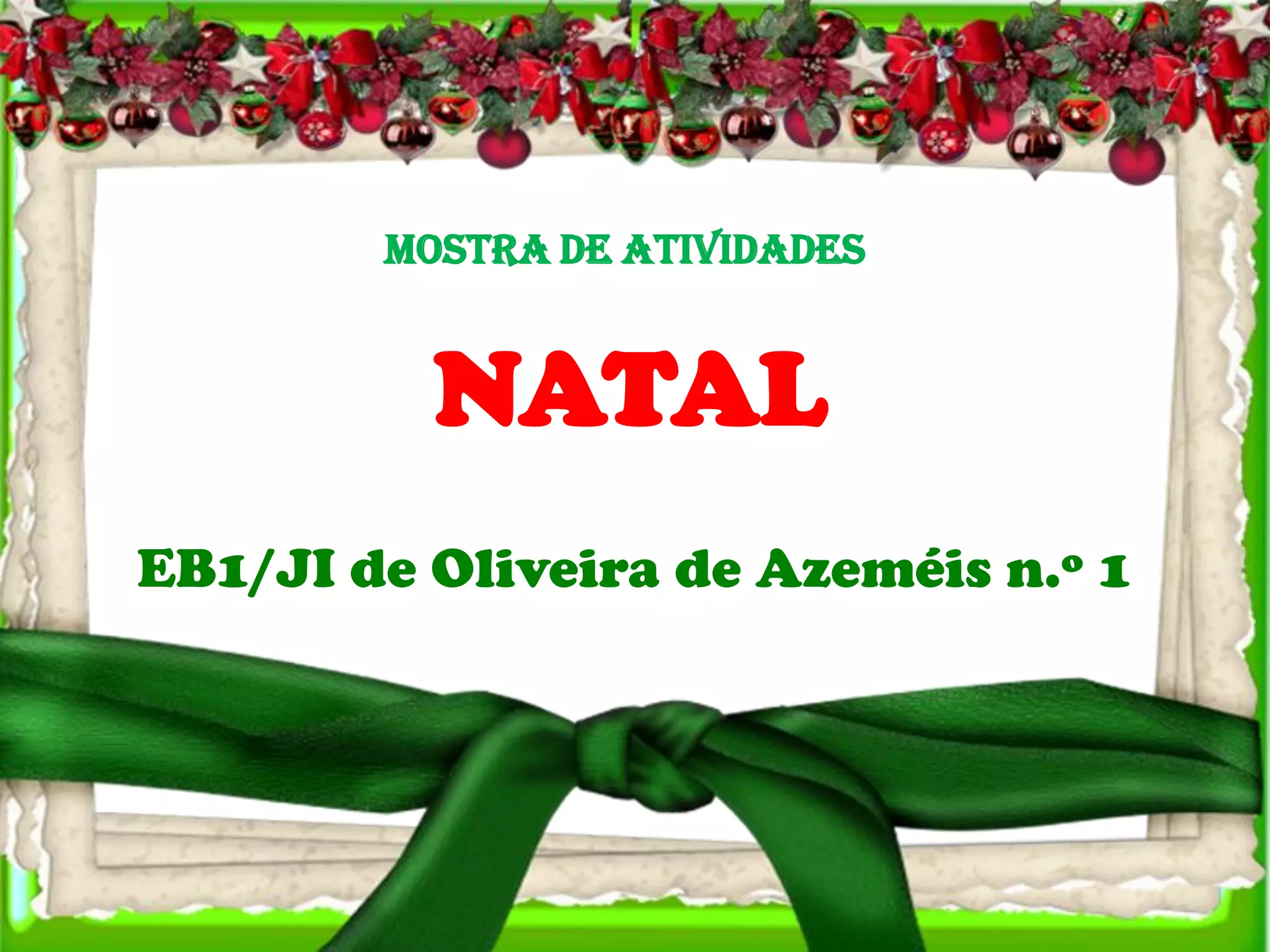 A mostra de atividades da escola EB1/JI de Oliveira de Azeméis n.o 1 inclui espetáculos de Natal para os alunos dos 1.o e 2.o anos no dia 3 de dezembro e para os alunos dos 3.o e 4.o anos no dia 4 de dezembro, assim como um espetáculo oferecido pela Associação de Pais da Escola no dia 4 de dezembro e um espetáculo da Câmara Municipal de Oliveira de Azeméis para as escolas do concelho no dia 10 de dez