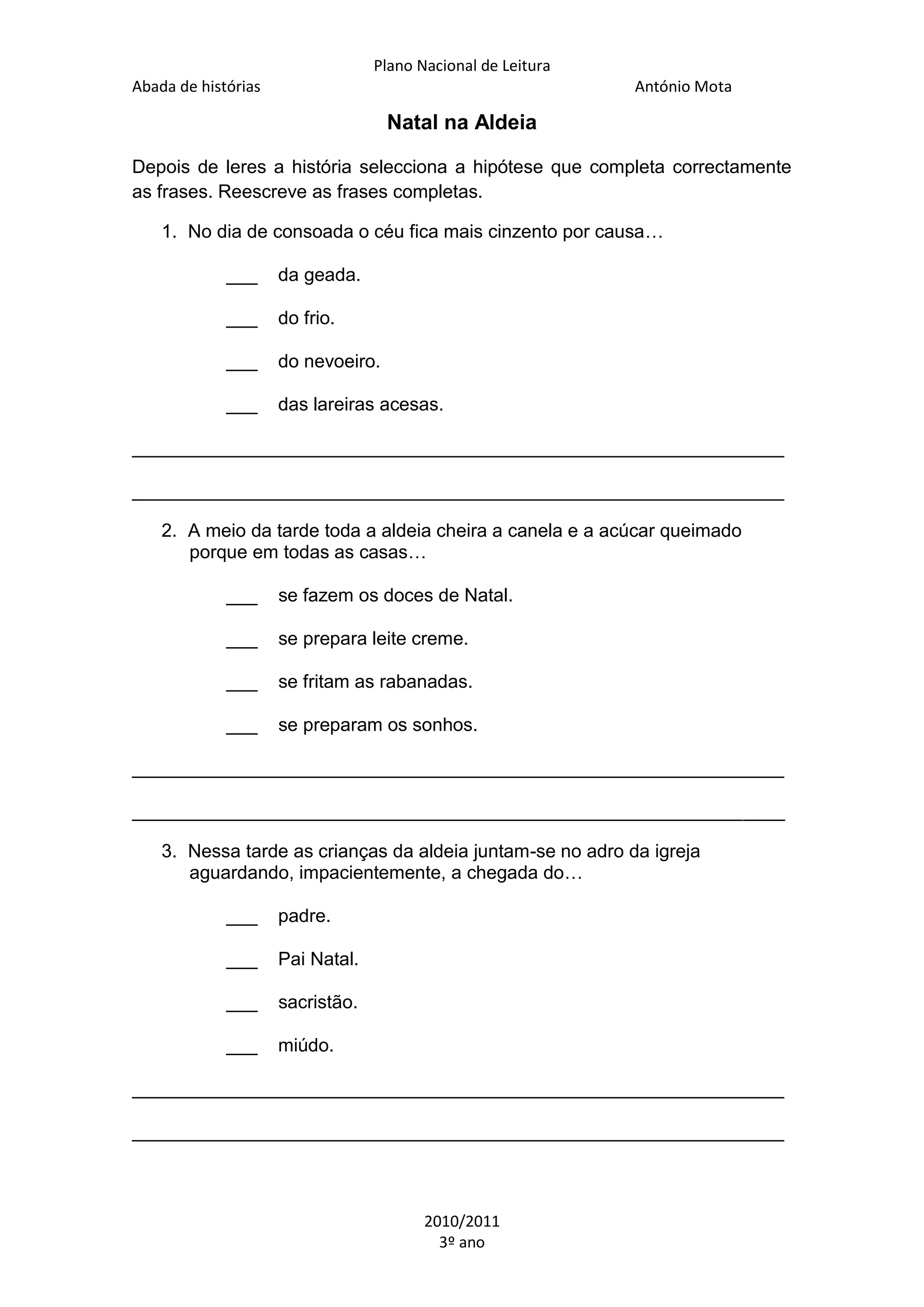 O documento apresenta um plano de leitura para crianças com uma história sobre o Natal numa aldeia portuguesa. A história descreve as tradições e atividades de preparação para o Natal, incluindo a construção de um presépio na igreja da aldeia pelas crianças usando materiais encontrados na natureza.